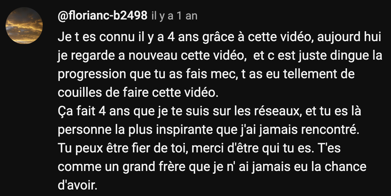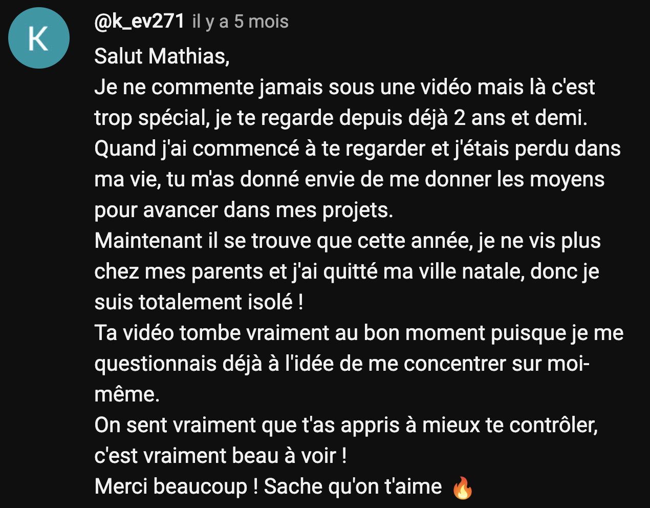 “Mathias fait selon moi parti des meilleurs créateurs de contenu en France. Ses vidéos me font voyager et certaines ont eu des implications considérables dans ma vie.”